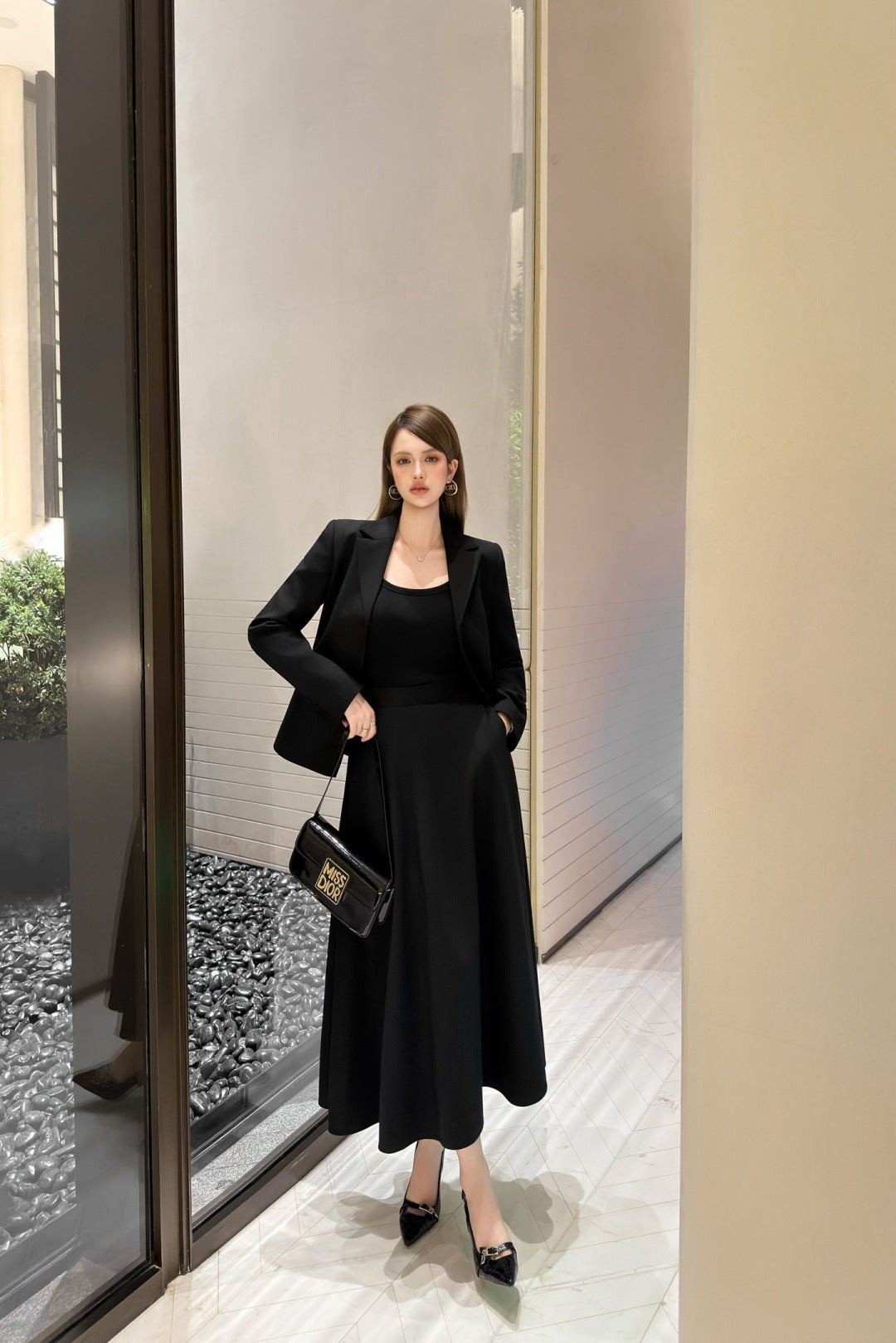 Cd 25fw straight-shoulder fitted waist suit with A-line skirt