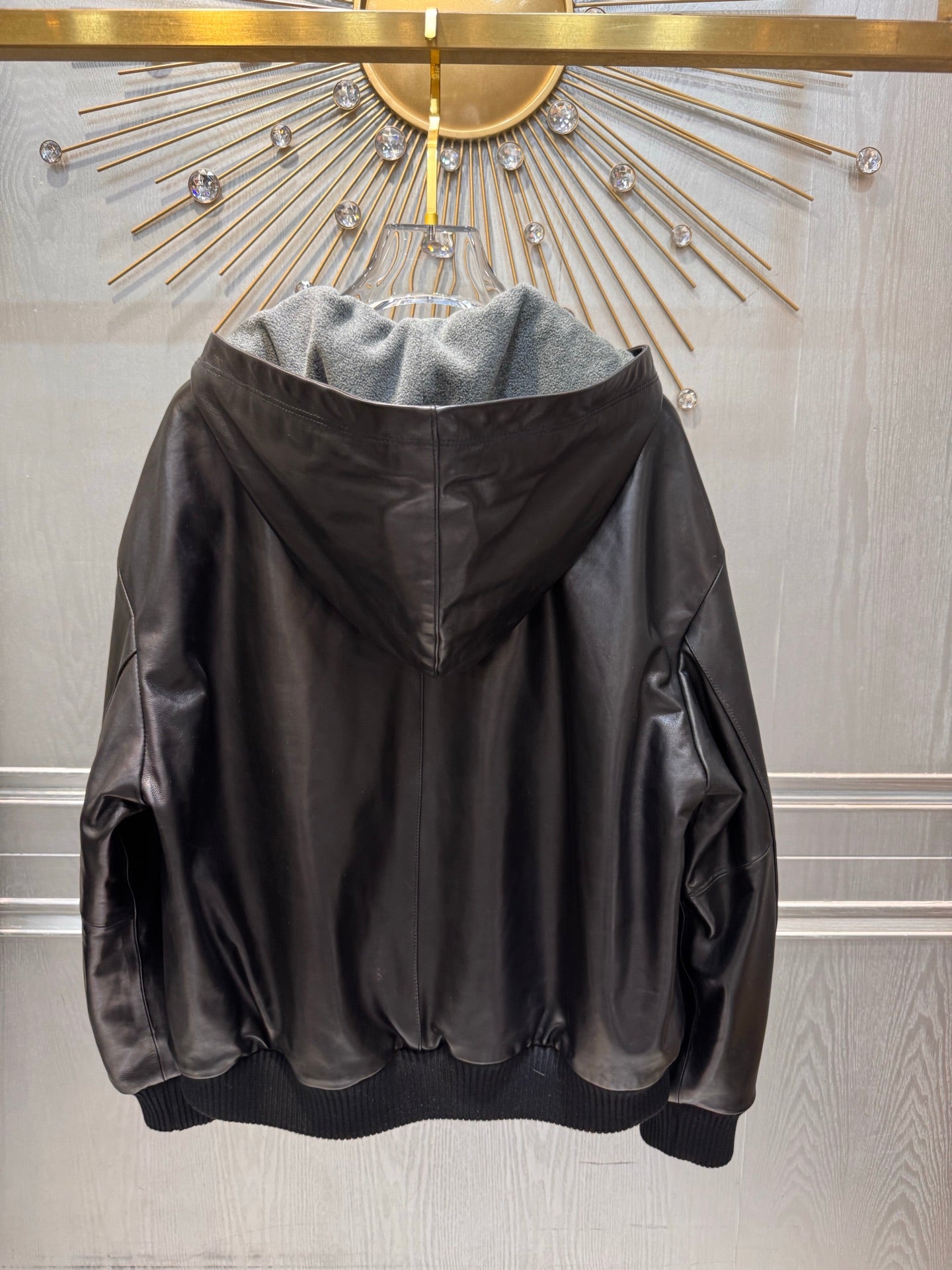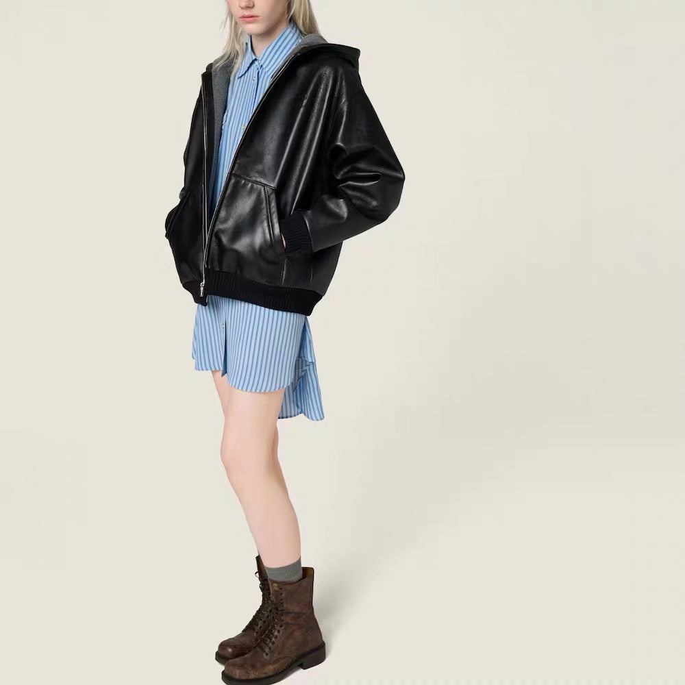 Miu**25fw black genuine leather jacket unisex